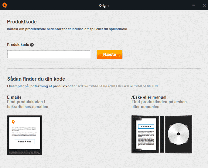 Første Step er faktisk rigtig simpel i Origin. Det kræver selvfølgelig at du har hentet deres klient / program på deres hjemmeside og at du har lavet en bruger. Når du har gjort det kan du i programmets venstre side se menubjælken Origin. Der klikker du, og du kan se et felt der hedder Indløs produktkode. her klikker du.